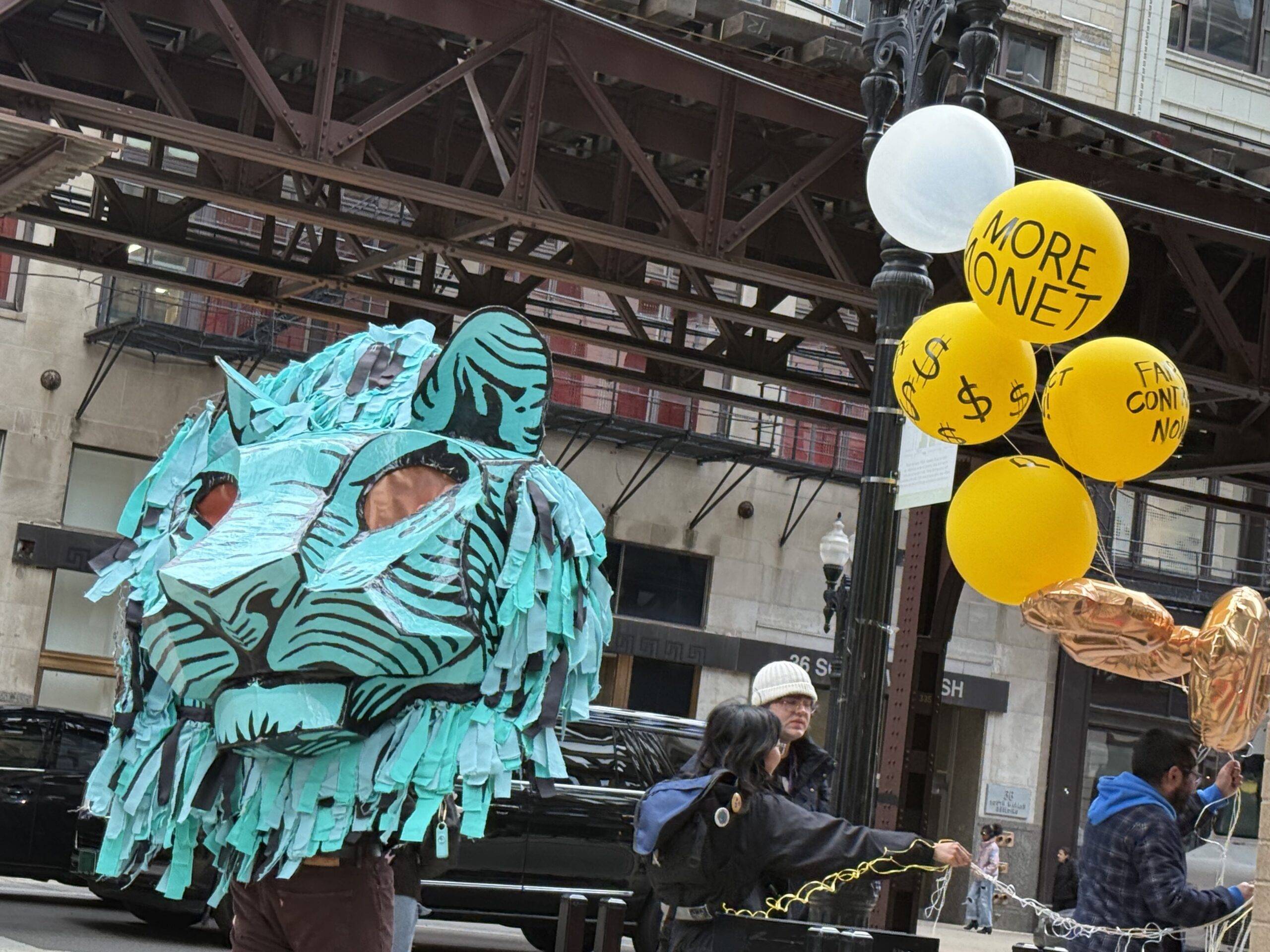 On April 15, 2025, faculty, students, and SAIC community members marched in a circle outside the SAIC Sharp Building, protesting in support of the Art Institute of Chicago’s Workers United. Much like the prior protest outside of the MacLean and Lakeview buildings on April 9, this was done to show solidarity with the bargaining committee before a bargaining meeting with the school later that same day. The protest included the AICWU teal lion mascot head as well as bright yellow balloons with phrases like “fair contract now” written on them in Sharpie.