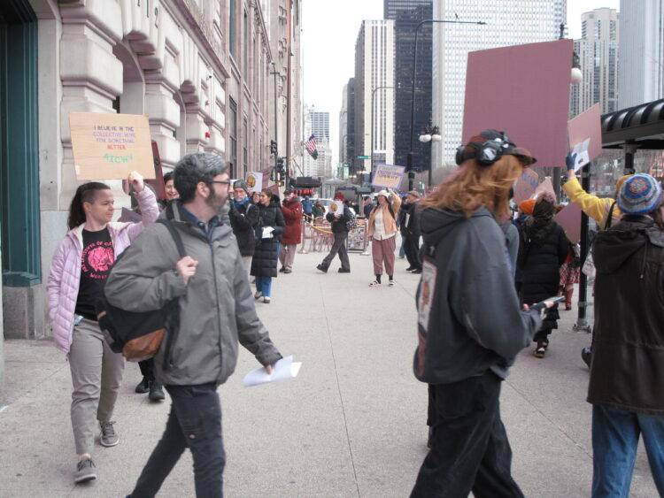 On April 9, 2025, on Michigan Ave., directly in front of the MacLean and Lakeview buildings, Art Institute of Chicago’s Workers United organized a protest in support of the bargaining meeting for the School of the Art Institute of Chicago’s Non Tenure Track Faculty happening later the same day. The protest included chants, speeches, and informative flyers detailing their nearly two years of bargaining efforts. Flyers included a link to their bargaining funds and multiple resources to contact the union. The protest concluded with a speech from Keefer Dunn, an adjunct associate professor in the Architecture, Interior Architecture, & Designed Objects department and a bargaining member of AICWU.