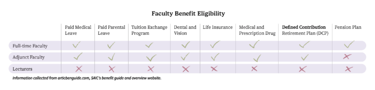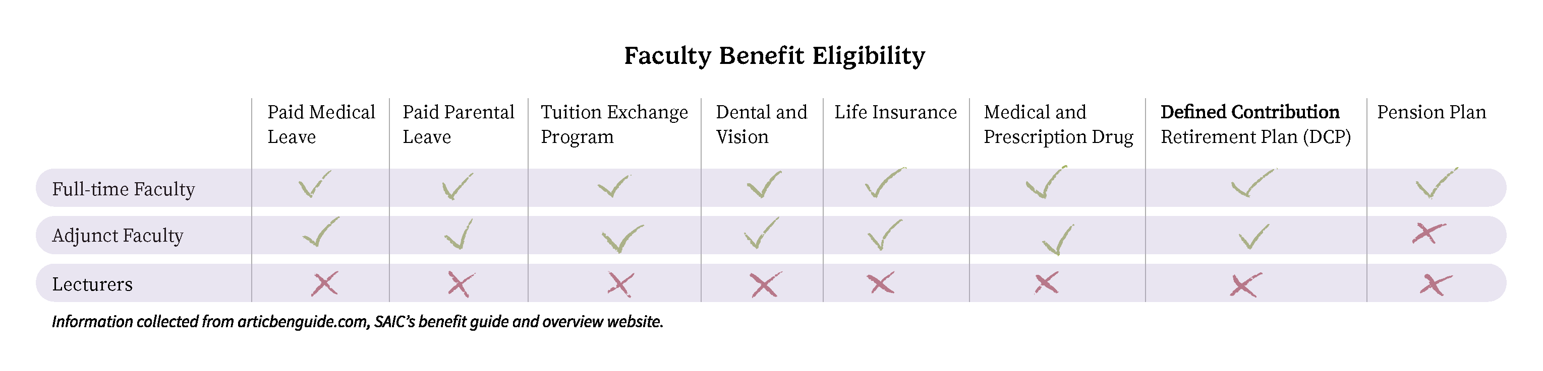 Part-time faculty at the School of the Art Institute of Chicago includes lecturers and adjuncts. Lecturers, however, have no benefits, only one representative within the faculty senate, no long-term contracts, and are paid less than permanent faculty. Despite being the faculty majority, lecturers are in the most vulnerable position and are more likely to leave academia.