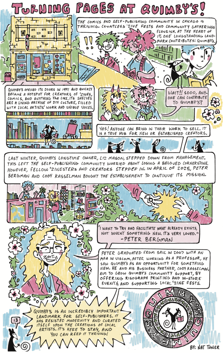 Narration: Last winter, Quimby’s longtime owner, Liz Mason, stepped down from management. This left the self-publishing community worried about losing a beloved cornerstone. However, fellow zinesters and creators stepped in. In April of 2025, Peter Bergman and Cody Kasselman bought the establishment to continue its mission.