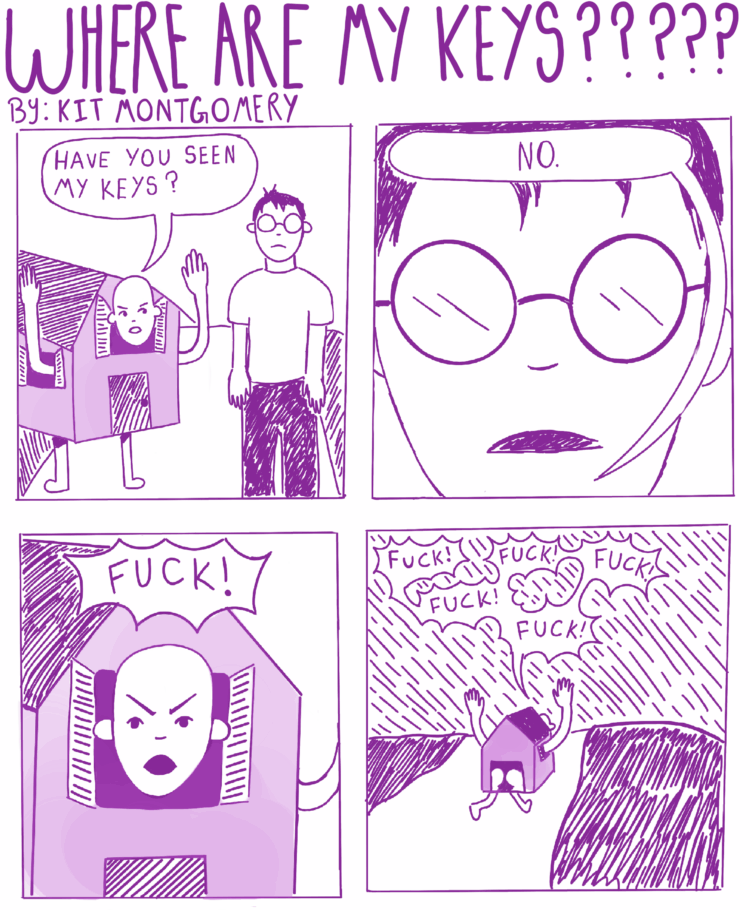 Comics Where Are My Keys????? Fuck! September 24, 2025 By Kit Montgomery Panel 1: A man in a house shouts where are my keys to a normal guy. Panel 2: The normal guy says no. Panel 3: The house shaped man shouts FUCK! Panel 4: The house shaped man shouts “FUCK! FUCK! FUCK! FUCK! FUCK!” and runs away Kit Montgomery F NewsComicsWhere Are My Keys????? TagsfunnySeptember 2025 print issue Previous articleTurning Pages At Quimby’s!Next articleLove Me Not, Then I Love You, and If I Love You, Beware! LEAVE A REPLY Cancel reply Comment: Please enter your comment! Name:* Please enter your name here Email:* You have entered an incorrect email address! Please enter your email address here Website: Save my name, email, and website in this browser for the next time I comment. Please enter an answer in digits:fifteen − 1 = Δ Post Archives Post Archives Select Month December 2025 November 2025 October 2025 September 2025 August 2025 July 2025 June 2025 May 2025 April 2025 March 2025 February 2025 January 2025 December 2024 November 2024 October 2024 September 2024 August 2024 July 2024 June 2024 May 2024 April 2024 March 2024 February 2024 January 2024 December 2023 November 2023 October 2023 September 2023 August 2023 May 2023 April 2023 March 2023 February 2023 January 2023 December 2022 November 2022 October 2022 September 2022 August 2022 July 2022 June 2022 May 2022 April 2022 March 2022 February 2022 January 2022 December 2021 November 2021 October 2021 September 2021 August 2021 July 2021 June 2021 May 2021 April 2021 March 2021 February 2021 December 2020 November 2020 October 2020 September 2020 August 2020 July 2020 June 2020 May 2020 April 2020 March 2020 February 2020 January 2020 December 2019 November 2019 October 2019 September 2019 August 2019 July 2019 June 2019 May 2019 April 2019 March 2019 February 2019 January 2019 December 2018 November 2018 October 2018 September 2018 August 2018 July 2018 June 2018 May 2018 April 2018 March 2018 February 2018 January 2018 December 2017 November 2017 October 2017 September 2017 August 2017 July 2017 June 2017 May 2017 April 2017 March 2017 February 2017 January 2017 December 2016 November 2016 October 2016 September 2016 August 2016 July 2016 June 2016 May 2016 April 2016 March 2016 February 2016 January 2016 December 2015 November 2015 October 2015 September 2015 August 2015 July 2015 June 2015 May 2015 April 2015 March 2015 February 2015 January 2015 December 2014 November 2014 October 2014 September 2014 August 2014 July 2014 June 2014 May 2014 April 2014 March 2014 February 2014 January 2014 December 2013 November 2013 October 2013 September 2013 August 2013 July 2013 June 2013 May 2013 April 2013 March 2013 February 2013 January 2013 December 2012 November 2012 October 2012 September 2012 August 2012 July 2012 June 2012 May 2012 April 2012 March 2012 February 2012 January 2012 December 2011 November 2011 October 2011 September 2011 August 2011 July 2011 June 2011 May 2011 April 2011 March 2011 February 2011 January 2011 December 2010 November 2010 October 2010 September 2010 August 2010 July 2010 June 2010 May 2010 April 2010 March 2010 February 2010 January 2010 December 2009 November 2009 October 2009 September 2009 August 2009 July 2009 June 2009 May 2009 April 2009 March 2009 February 2009 January 2009 December 2008 November 2008 October 2008 September 2008 August 2008 July 2008 June 2008 May 2008 April 2008 March 2008 February 2008 January 2008 December 2007 November 2007 October 2007 September 2007 August 2007 July 2007 June 2007 May 2007 April 2007 March 2007 February 2007 January 2007 December 2006 November 2006 October 2006 September 2006 June 2006 May 2006 April 2006 February 2006 December 2005 November 2005 October 2005 September 2005 July 2005 April 2005 March 2005 February 2005 December 2004 November 2004 October 2004 September 2004 May 2004 April 2004 March 2004 More Articles Comics Dave Lyne: Starr Ramone Comics Our Existence is Protest Comics angel grwm Comics Xeno-Makeouts