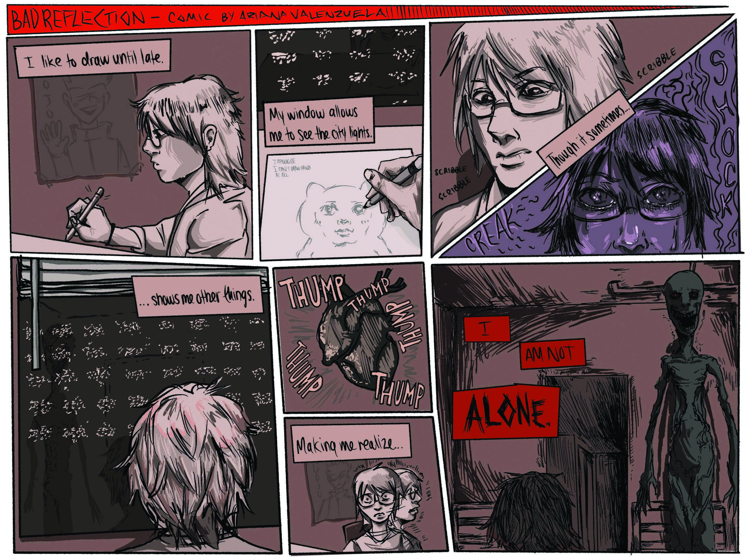 The panel now displays the back of the individual’s head viewing the building lights through the window. Though there is the reflection of the silhouette belonging to the individual and another revealing an eerie creature on the window. A speech bubble reads, “…shows me other things.”