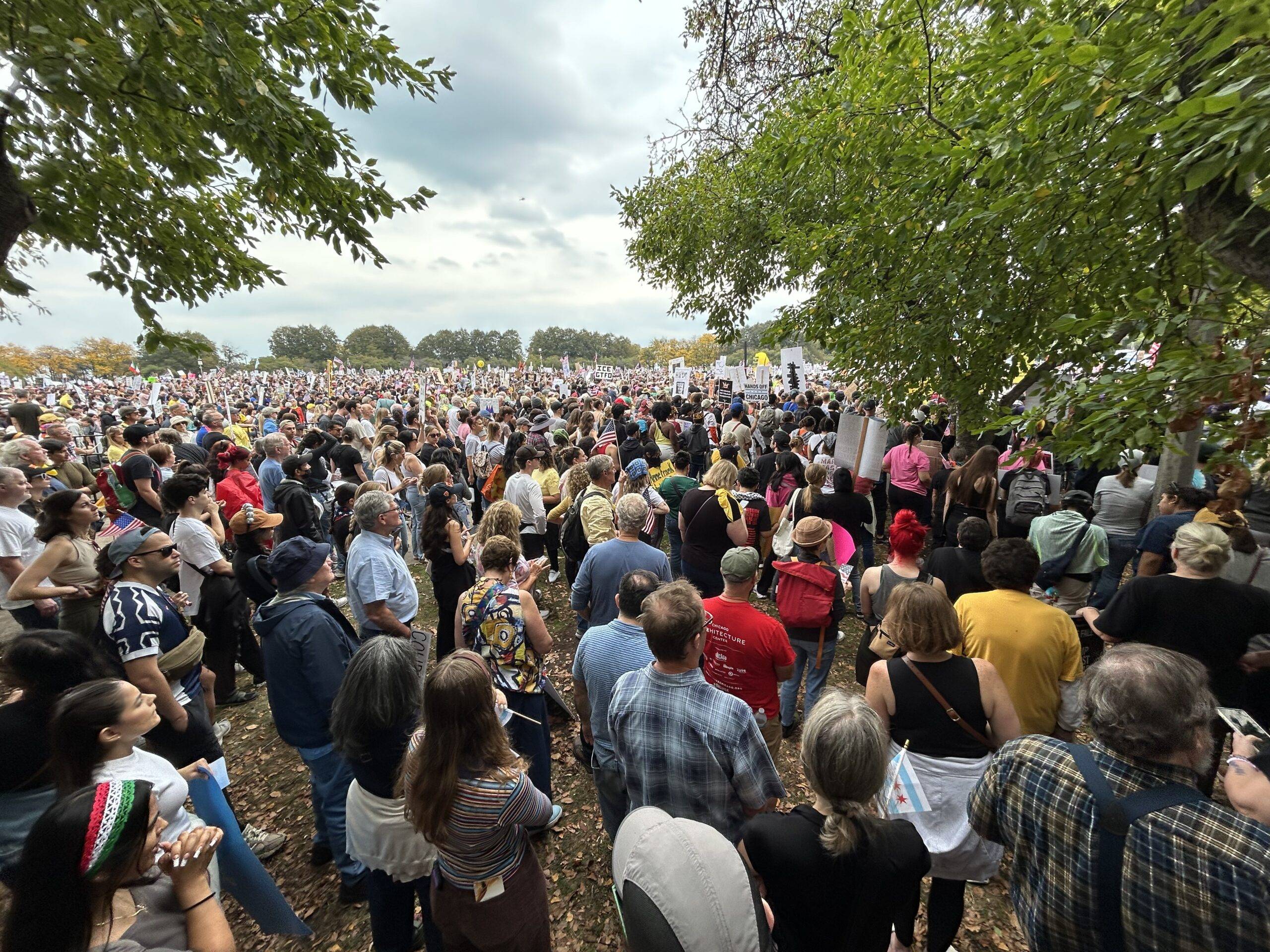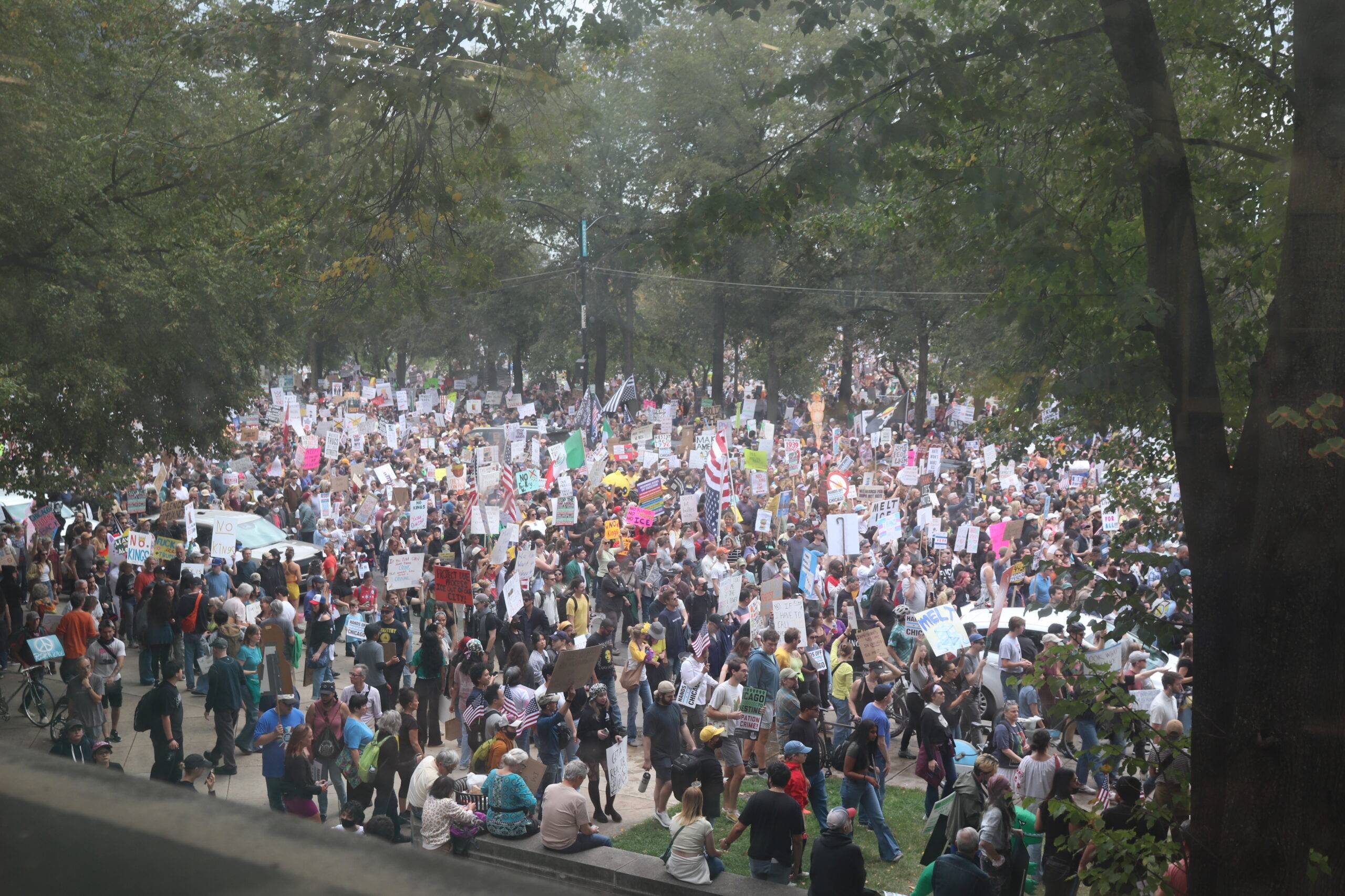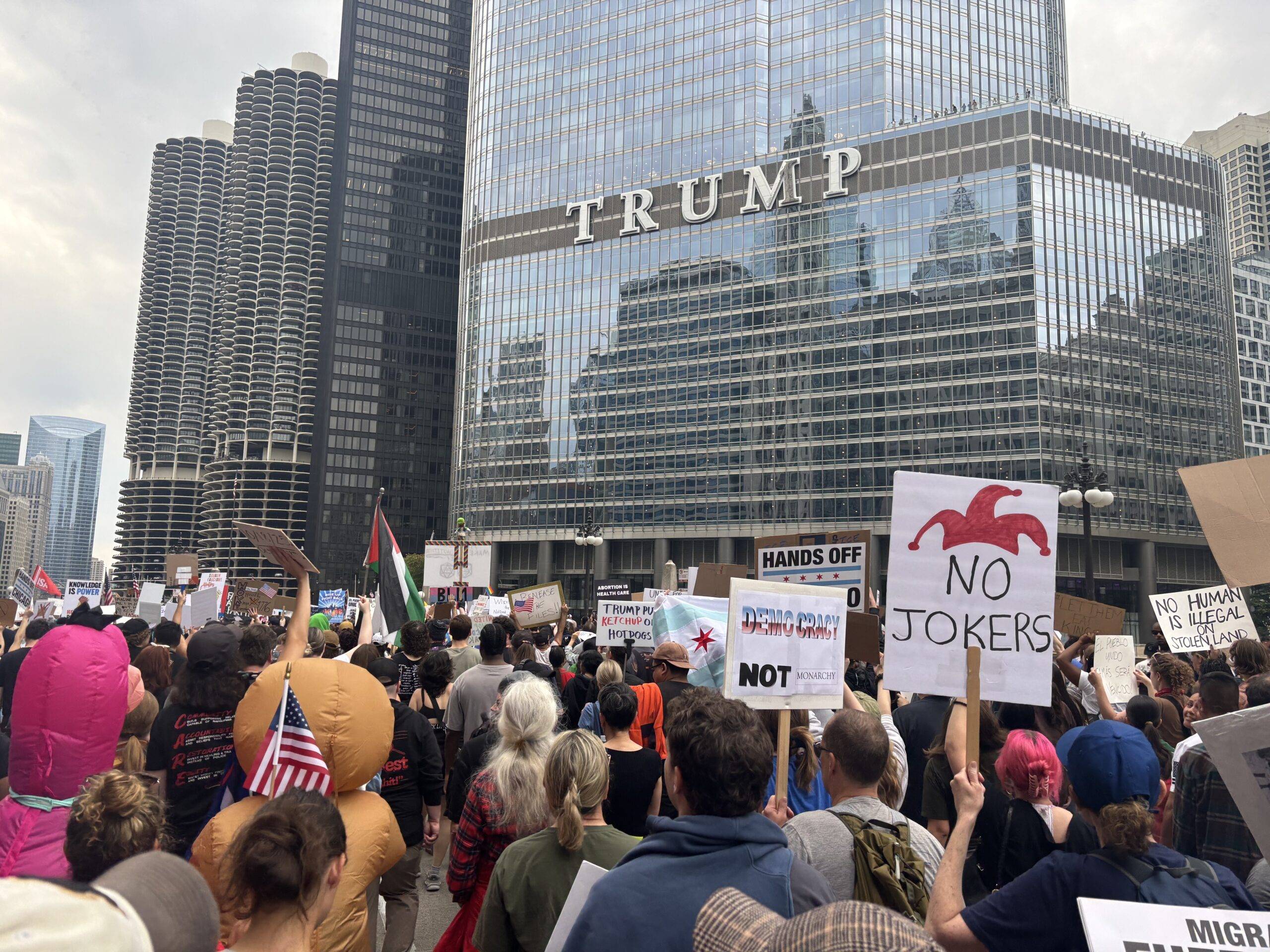 The path was two miles through downtown along Michigan Avenue and near the Trump tower. As many as 250,000 people showed up, surpassing June’s “No Kings” protest numbers of around 75,000.