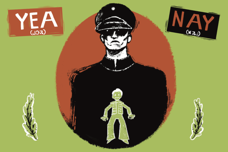 At the Boston show, the colors of the signs were switched. At the Tampa show, the signs read Yae on both sides. It was a not-so-subtle nod at the illusion of choice in a democracy.