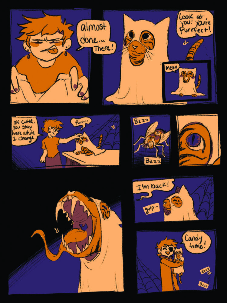Panel 9: The character holds the tabby cat and says “Candy time!” The tabby cat looks