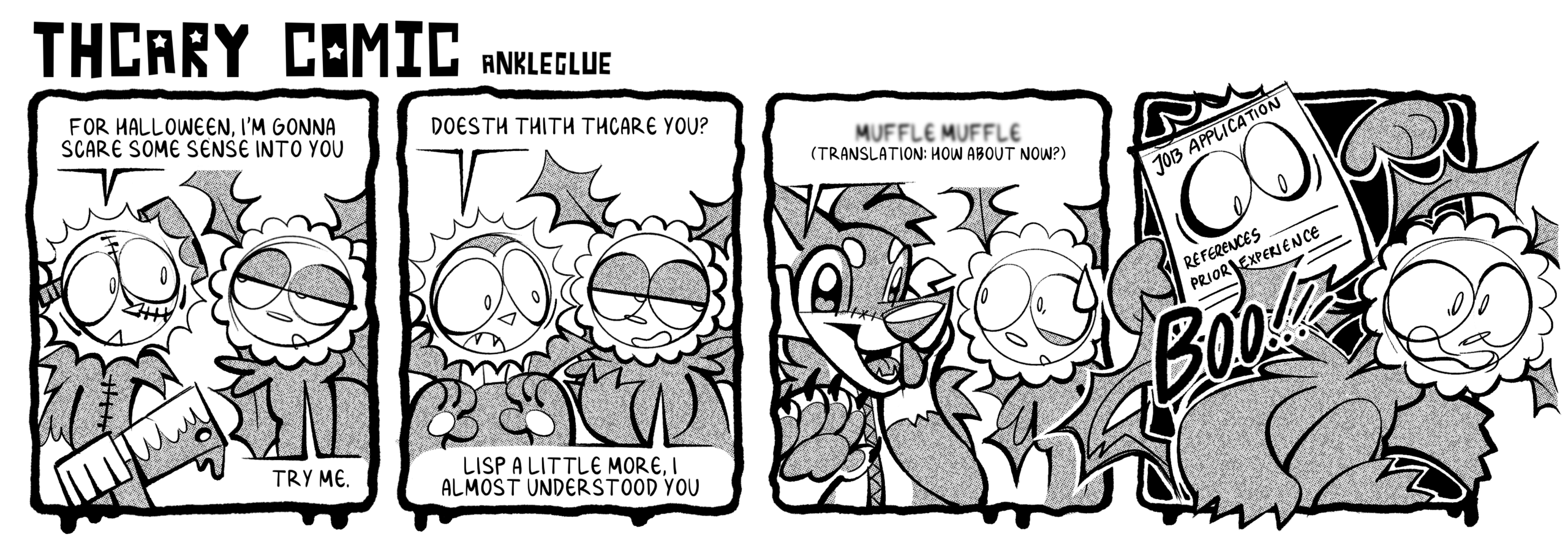 Panel 2: Now, Dan is dressed as a vampire. He has a stereotypical vampire widow’s peak, fangs, and a black cloak. He asks Andy, “Doesth thith thcare you?” Andy looks away from him with an amused smile and replies, “Lisp a little more, I almost understood you.”