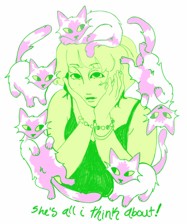 The person is a light green with dark green lineart and the cats also share the dark green lineart with light pink accents in their fur.