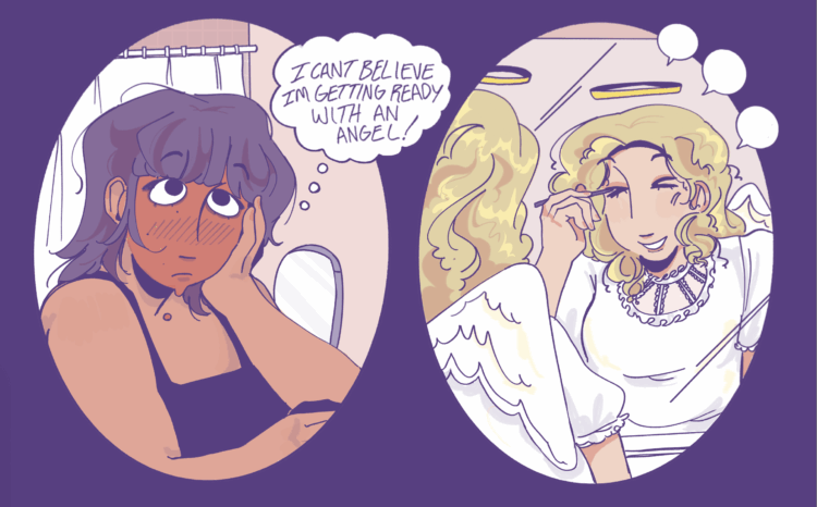 Image of an angel from behind, with her reflection in the mirror. We see her with angel wings, white clothing, and a halo. In the reflection she is putting on eyeliner with a happy expression on her face. Three small blank conversation bubbles are to the right of her face.