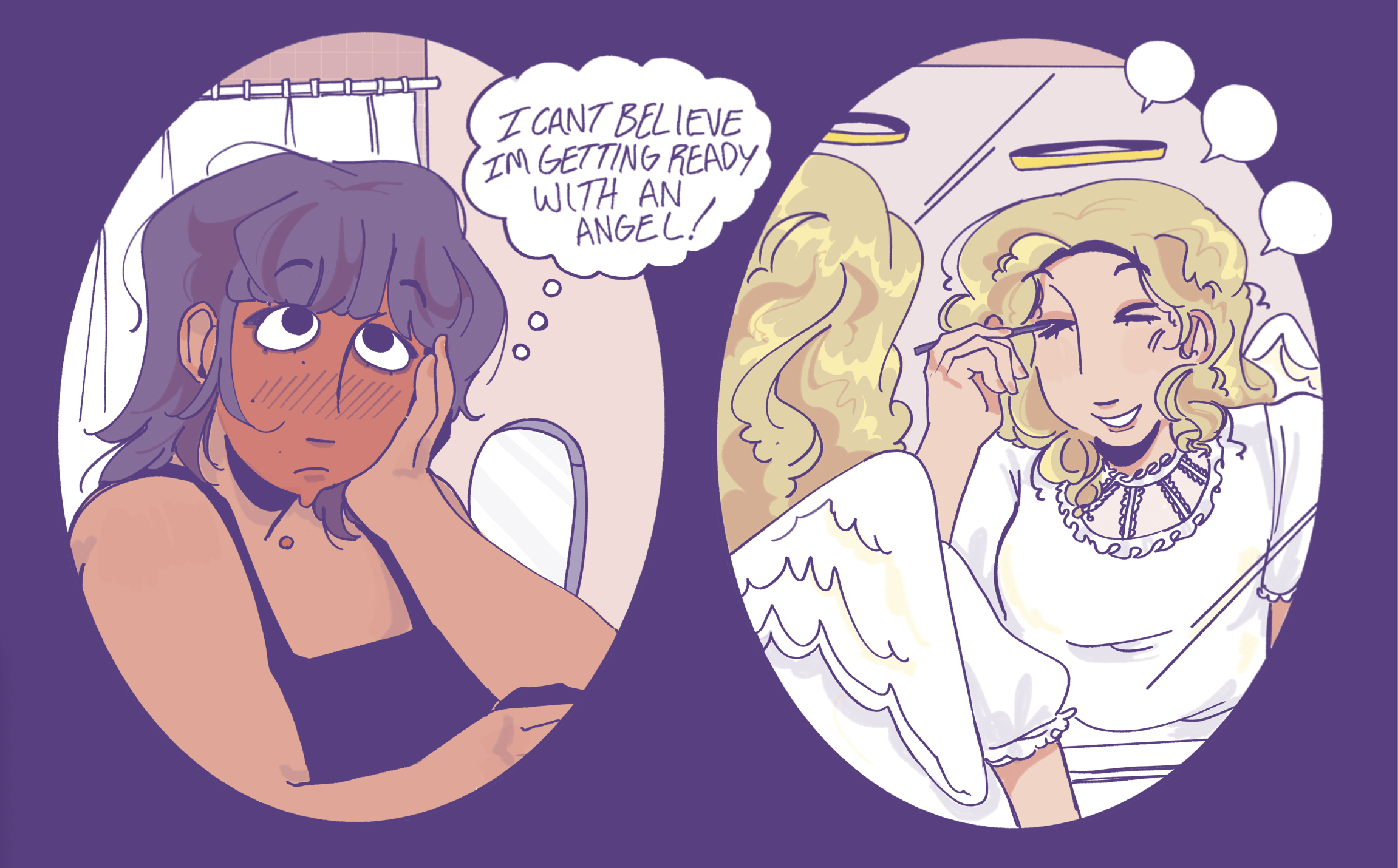 A thought bubble reads “ I CANT BELIEVE IM GETTING READY WITH AN ANGEL!”