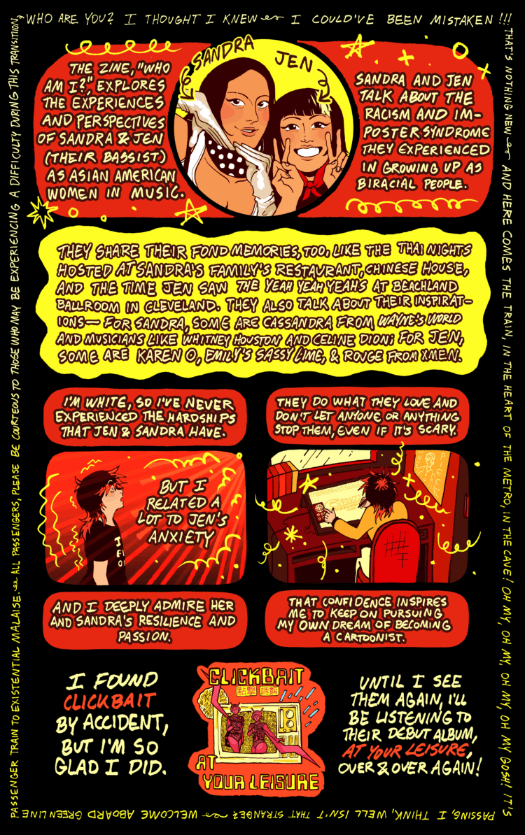 Panel 1: Narration: The zine, “Who Am I?” explores the experiences and perspectives of Sandra & Jen (their bassist) as Asian American women in music.