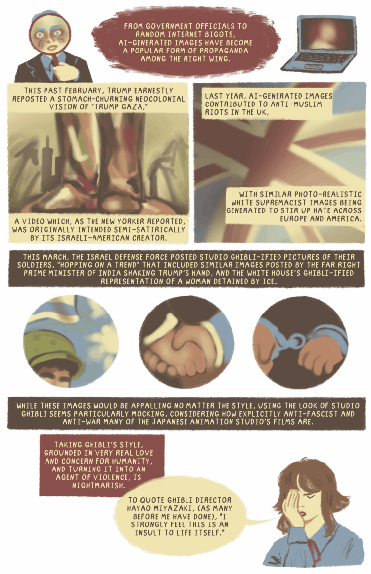 This March, the Israel Defence Forces posted Ghibli-ified images of their soldiers, “hopping on a trend” that included similar images posted by the far right prime minister of India shaking Trump’s hand, and the White House’s Ghibli-ified representation of a woman detained by ICE.