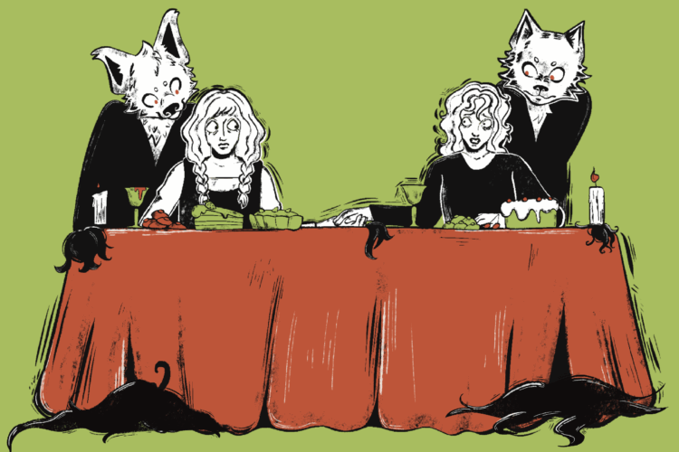 When the wolves came in droves soon after, trailing out of the woods with sunlight nipping at their heels, Aster and Edith felt rapturous. The creatures seemed to be dusted with sugar, shampooed in gold. Their black fur glistened, and their ruby eyes glowed. Clothed in crisp white dresses, fur teeming around their throats, they moved like gentle-women with the rehearsed delicacy of prey. Their bodies were those of humans: soft-skinned and bare; but their heads were those of wolves: matted fur, pointed ears, sharp teeth, long nose. They trailed past each house in the village, jubilant and joyous, raucous and inviting. They danced and hummed and sang — their howls, once sinister in the distance, now melodic and divine. The sisters saw themselves outlined in the beasts’ existence; witnessed, within their gloved hands, something they’d always craved — and a revived hunger sited within them, one which had never before been sated.