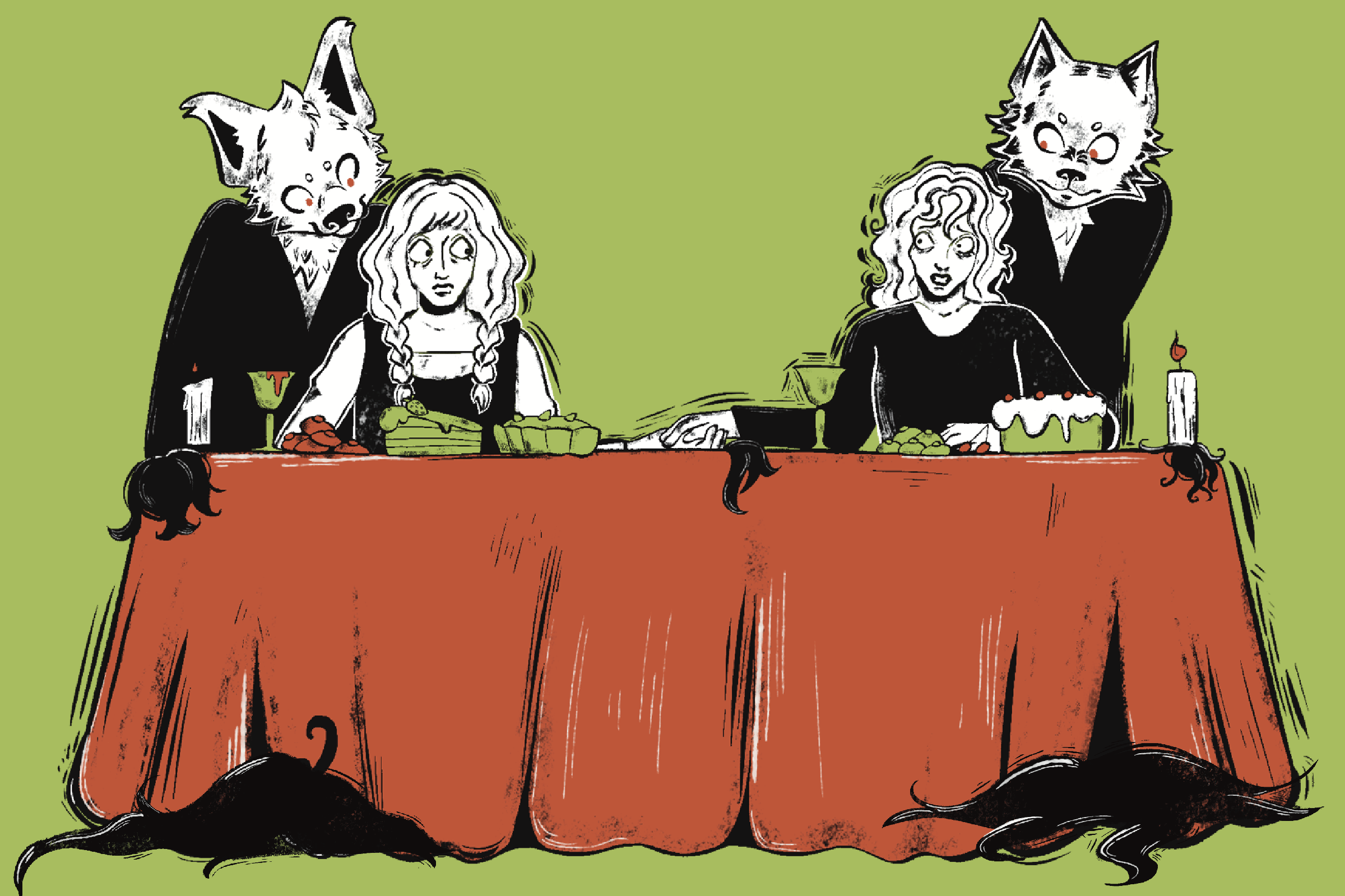 It was through no ability of their own that the sisters found themselves sitting in the grand spoils of the dining hall. The table was long and set with a mountain of tumbling sweets — finger cakes and jelly cookies, fruits and tea, cherries dipped in liqueur with goblets of wine, and chocolate orange tarts that crumbled to pieces. There was fine china, napkins edged with spidery lace, and, all around them, the ruby eyes of the wolves watched each move they made.