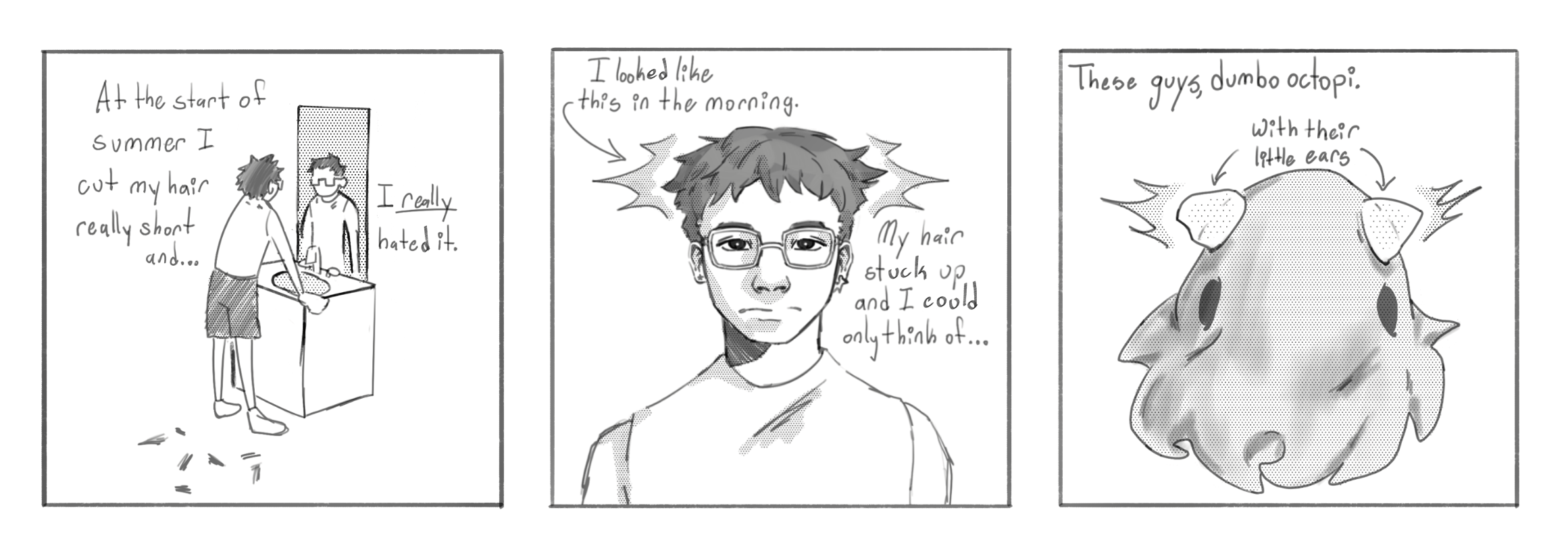 Panel 3: “These guys, dumbo octopuses, with their little ears.” A drawing of a dumbo octopus is centered with their ears having the same zigzag marks as my portrait did in the previous panel.