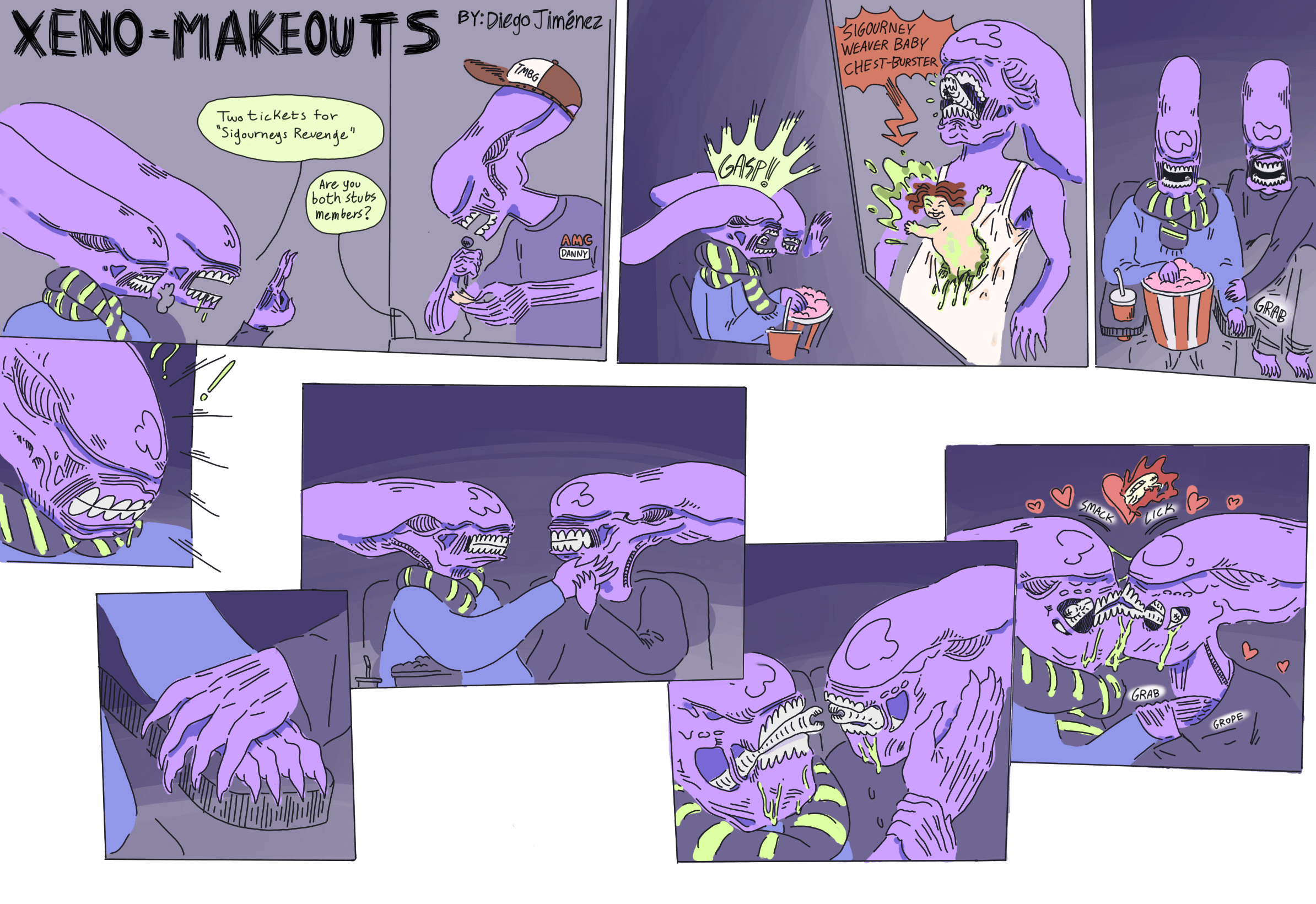 The Xenomorphs kiss and hold each other. Green drool dribbles down their chins. There is a graphic of a Xenomorph baby bursting out of a heart.
