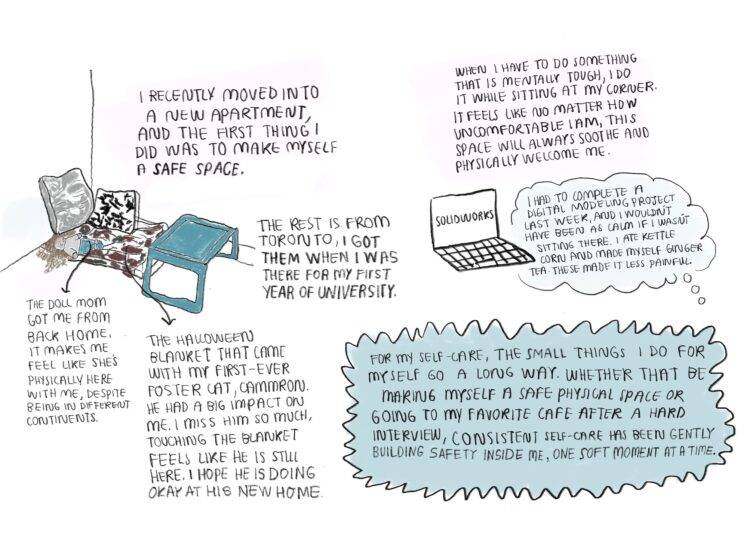 Creating Safety is a 3-panel comic that details how the artist created a symbolic ‘safe space’ for themselves when they moved into a new apartment and explains how the space helps with their self-care.