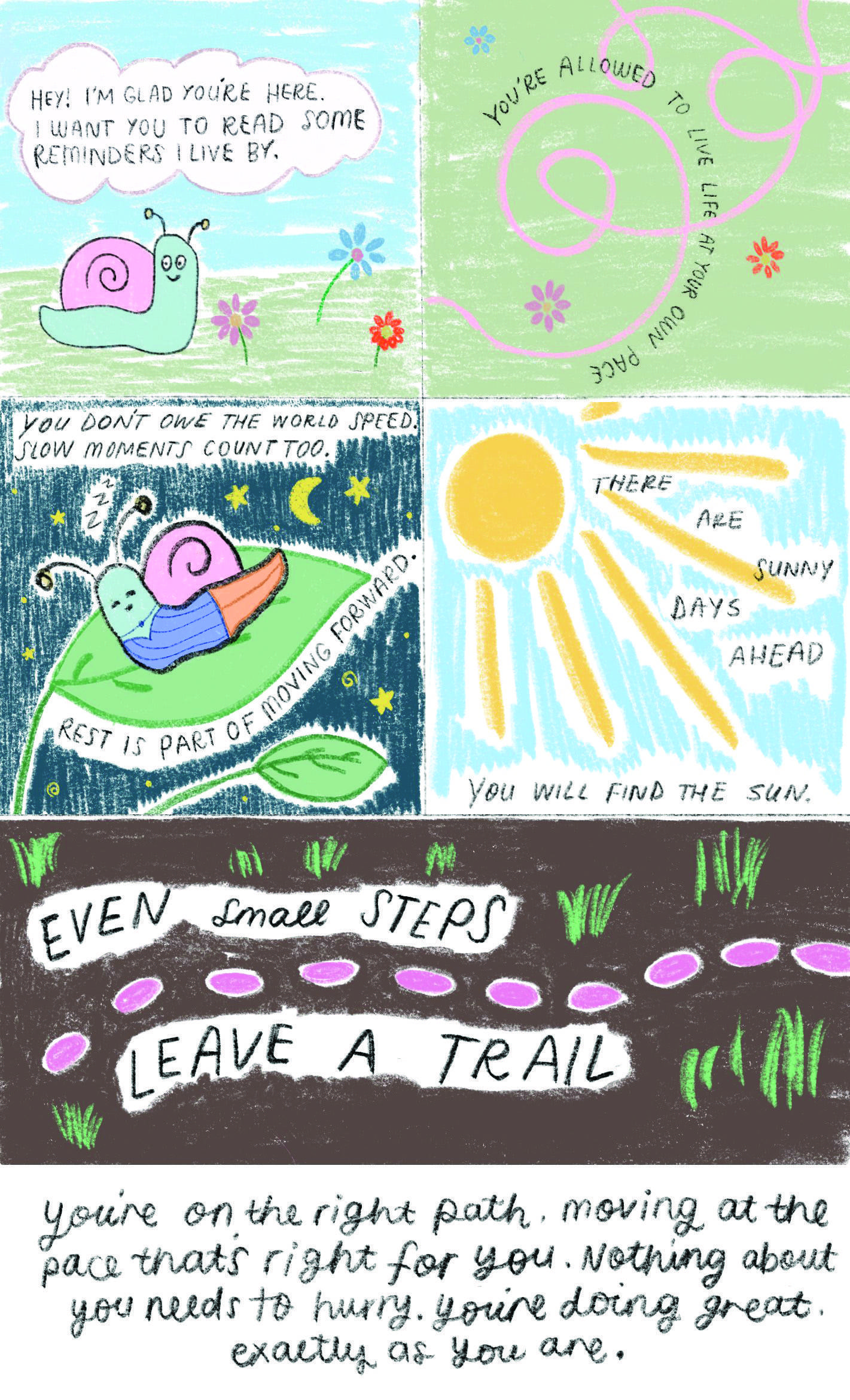 The last panel concludes the comic with final reminders: “You’re on the right path, moving at the pace that’s right for you. Nothing about you needs to hurry. You’re doing great, exactly as you are.”