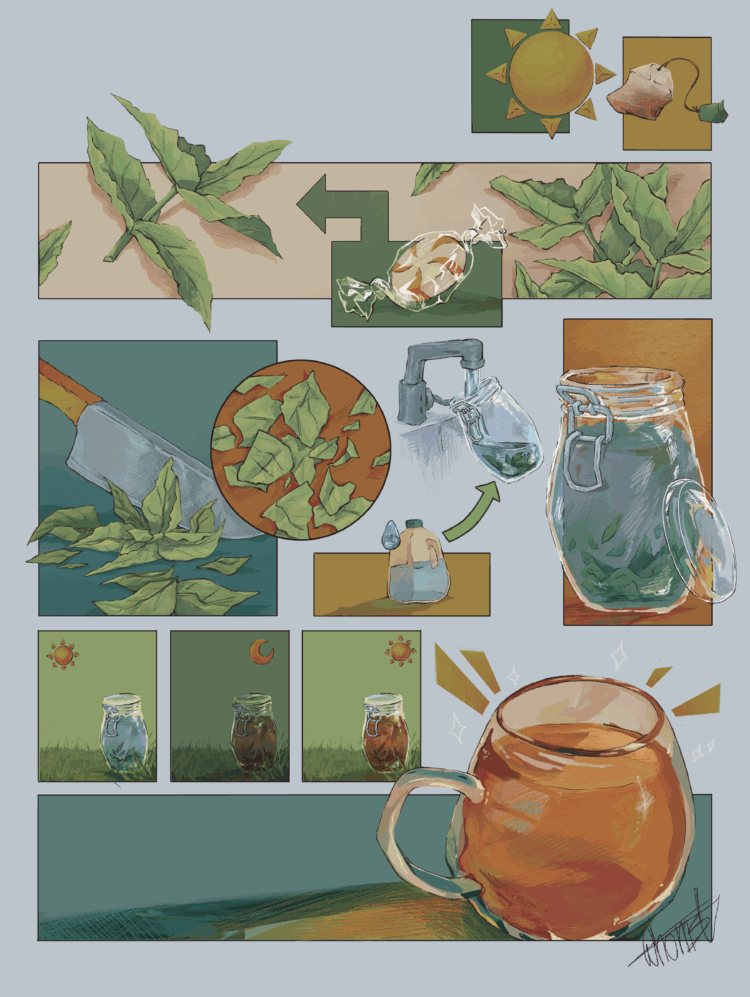Panel 12: The sun has risen again; 24 hours have passed since the jar was placed outside, and the tea is darker.