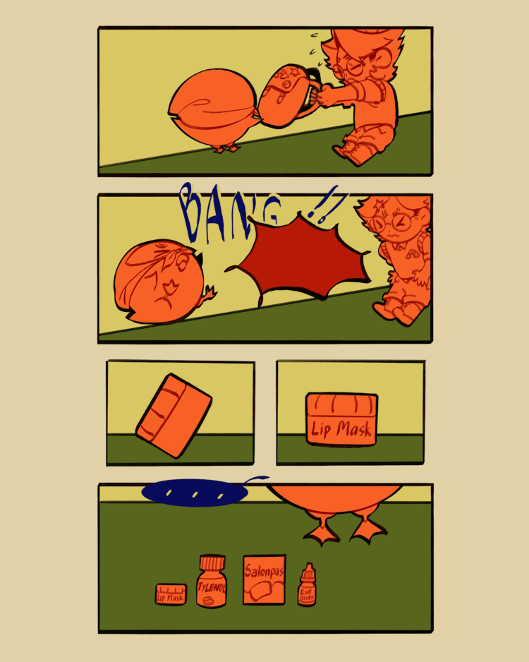 The lip mask bottle from the bag fell off, revealing a bunch of other stuff behind it: a lip mask, a Tylenol bottle, a Salonpas box, and eye drops for dry eyes (in left-to-right order).