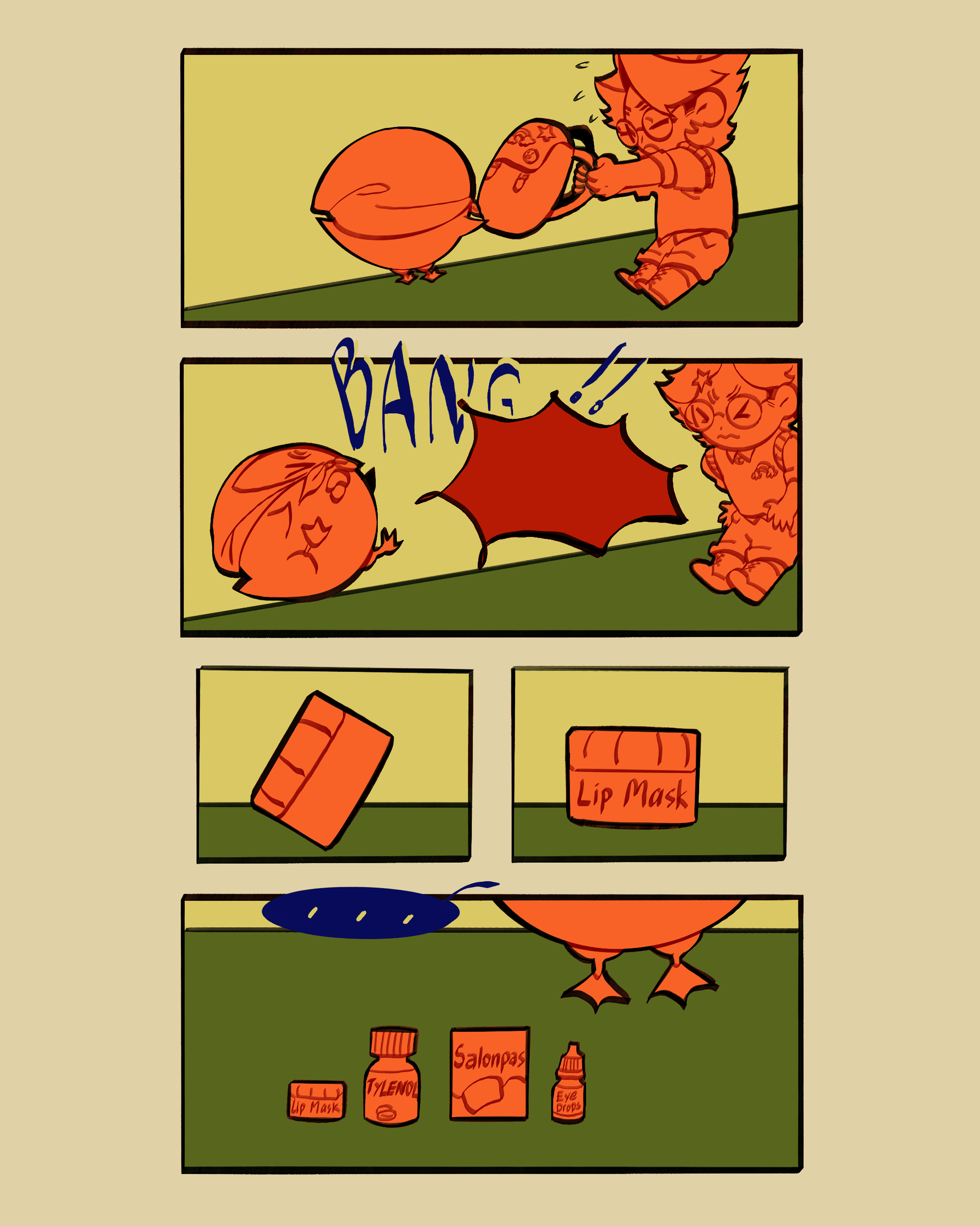The lip mask bottle from the bag fell off, revealing a bunch of other stuff behind it: a lip mask, a Tylenol bottle, a Salonpas box, and eye drops for dry eyes (in left-to-right order).