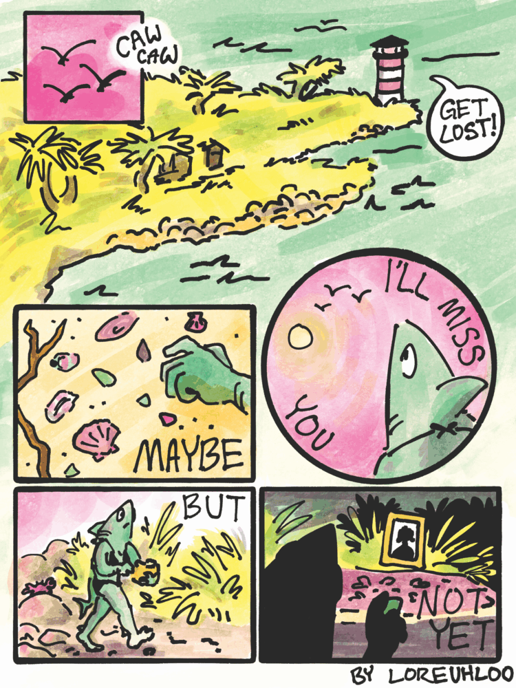 Second Panel: There is a tropical island with a lighthouse at the end of the peninsula. From the lighthouse someone yells ‘GET LOST!’