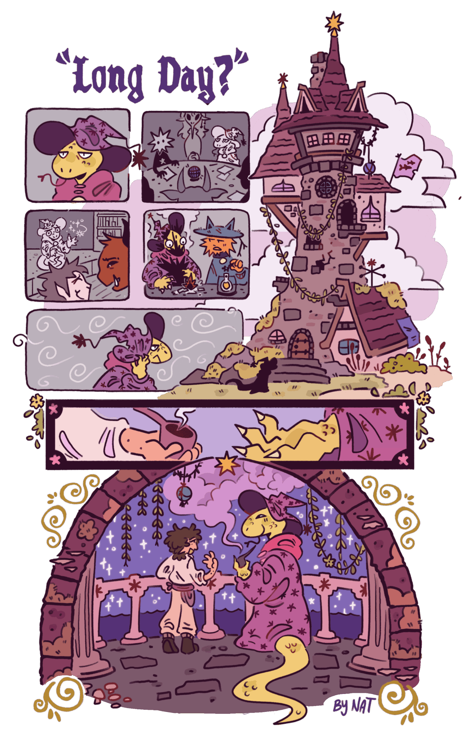 The bottom of the page is a panel shaped like a stone archway. The lizard and his elf-friend stand together on a balcony, looking happy in each other’s presence. There are stars in the sky behind them. The two smoke from the wooden pipe together.