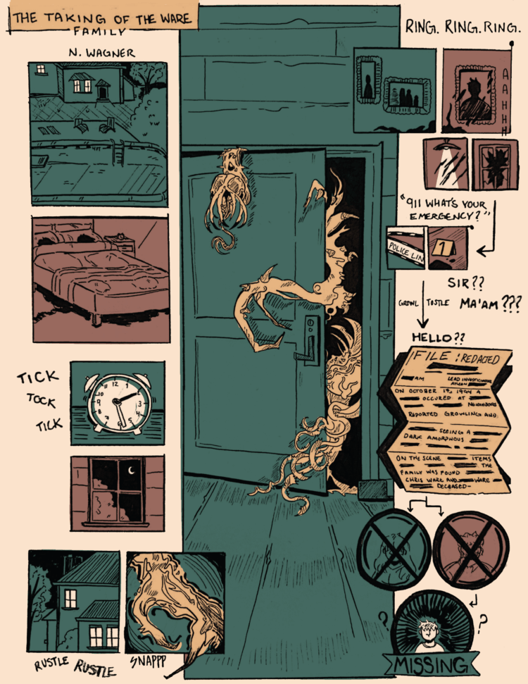 A 17-panel comic featuring a night of disappearances, murders, and an unknown apparition of pure