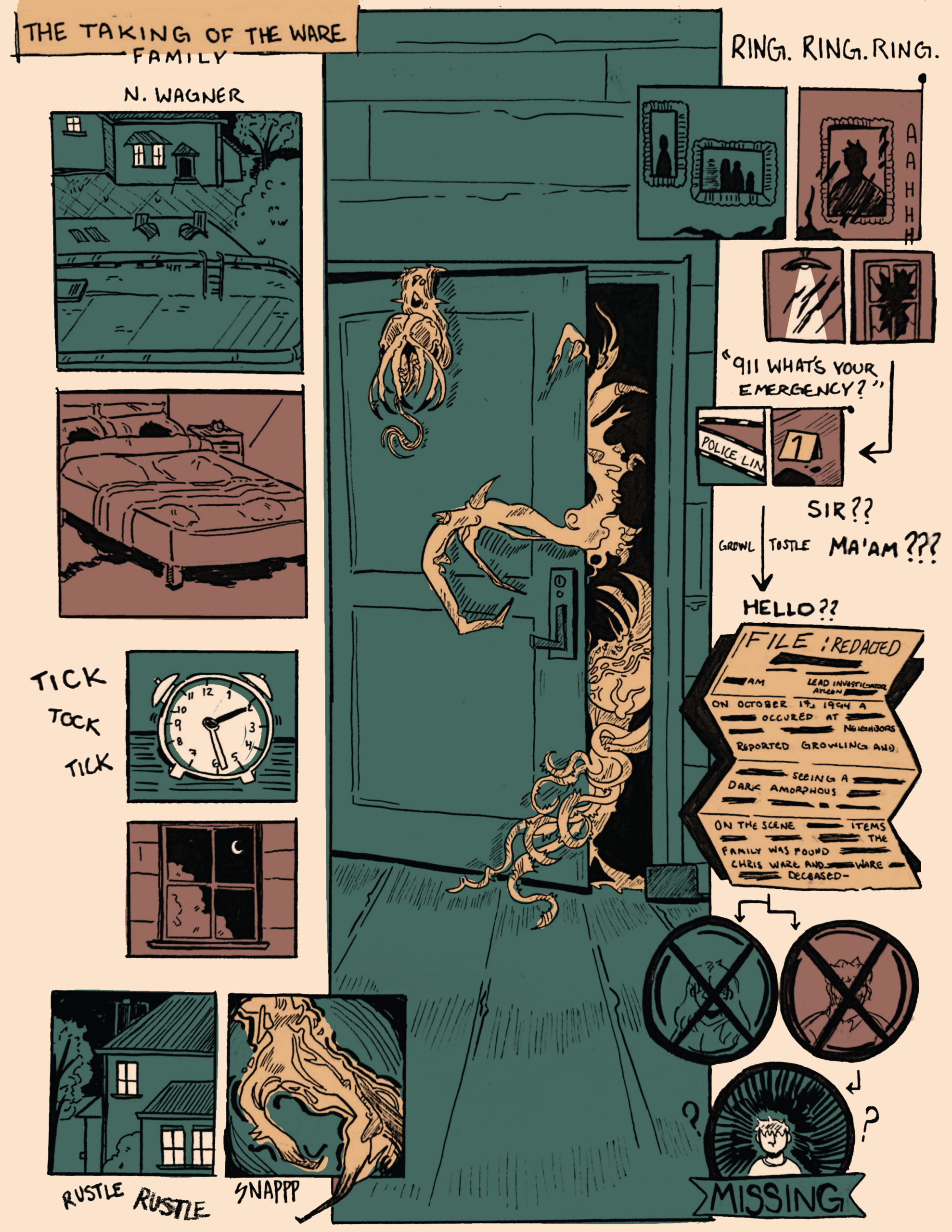 terror. A family is taken, and a crime scene is laid out. Scratches and other mess are scattered around the