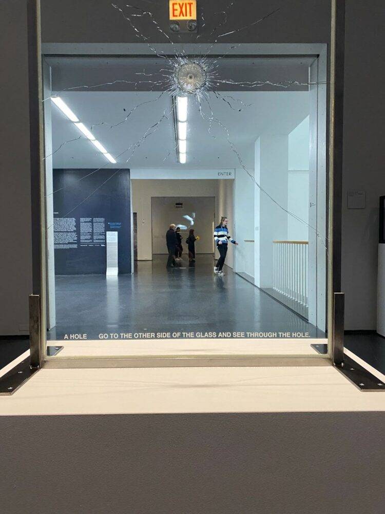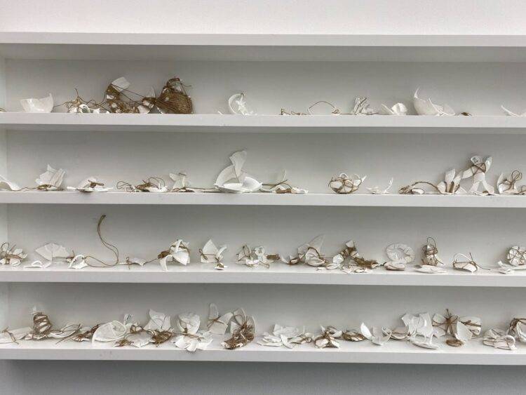 A week later, I returned to the exhibition alone, and though this allowed me the freedom to roam at my own pace, the show is not meant for one — I had no hand to shake through the hole in the canvas, and no one with whom to play monochromatic chess. Across from the olive trees, a man attentively mended a plate at a table near mine, where I sat making a mess of glue and tape. After proudly placing his piece on a shelf, he looked around at others’ works. “So, which one is yours?” he asked the security guard. She pointed to her piece, and he took a photo of her grinning next to it: a half-bowl with a glued-on twine smile.
