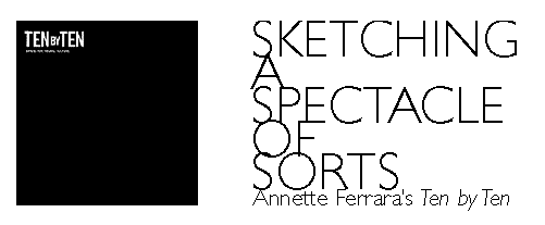 Ferrara has certainly managed her resources well. The fifteen "hard-core" volunteers for the pilot issue were a group of her (obviously talented) friends that met together one night to discuss the possibility of creating an arts magazine. Ferrara comments that "most were in their 20s, so everyone had professional jobs but were looking for some creative satisfaction." After amassing a significant amount of obscure magazines dealing with similar issues, Ferrara and friends distilled an idea of their content, their audience, and their own participation. They decided that they wanted equal importance to be placed on design and editorial reviews, setting aside at least one page to be without text, entirely focused on design. The editorial tone was meant to be sophisticated, catering to readers with a college education, but Ferrara notes, "because everyone had post-grad education and was very tired of that kind of language, we decided it should be accessible -- without all the buzz words and codified language." And so Ten by Ten was born.
