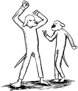These characters find themselves in limbo, perhaps on the long return from a lost battle. They are all symbols that signify nothing: Jackie, the fat cannon, Joan of Arc, the severe fashion victim. Naked man-boys. The radio, scanning the airwaves of time. Joan of Arc is searching for a meaning, or her bearings, in the endless radio waves bouncing around through history. Nothing happens, so they continue in circles. It is absurd and incongruent imagery that is jarring and captivating. It seeks to imply and confuse rather than state anything.