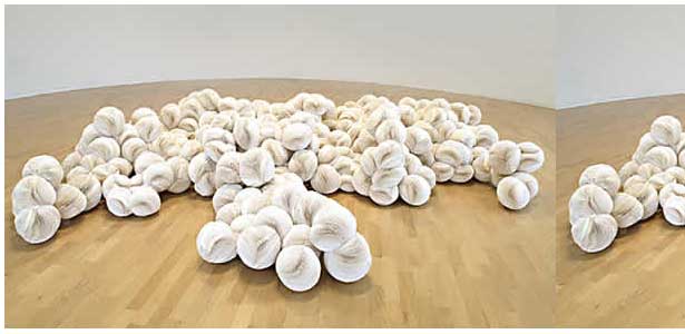 Tara Donovan Ace Gallery, LAby Ed Shad Tara Donovan's installations are of this world, but are far from ordinary. Most of her assemblages are made from the fringes of cubical desk organizers or Chevy toolboxes: pencils, styrofoam coffee cups, stick pins, toothpicks, fishing wire, shattered glass, roofing felt, and electrical wire. The materials are set, known, and recognizable, but the result is Jacques Costeau's camera on the ocean floor or a National Geographic image of a remote part of Australia; in other words, Donovan's world is a bizarre one that we want to visit, and she has no trouble taking us there with brilliant artifice.Inside the tall, austere spaces of Los Angeles' Ace Gallery, Donovan arranges a series of sets in which we act, playing our fancies in dream terrarium. Using thousands of multicolor buttons, she creates a floor-size ocean reef, multicolor sponges seemingly sifting the gallery air for enrichment. The next gallery uses fishing wire to conjure a blanket of sea urchins, like hundreds of shimmering ladies' powder puffs. In her largest installation, Styrofoam cups make up dozens of lit bulges, recalling the underside of a sack of spider eggs. Organic forms and landscapes are a dominant, yet not entirely encompassing motif in the work. As Michael Knight recently observed, there are minimalist undercurrents, the desire to "eliminate composition and focus on the singular object." However, if Donovan is a minimalist, it is of a sort that does not mind illusion and poetics. Even Donovan's large cubes - toothpicks, pins, and glass held together by gravity and friction - are strange surfaces, masses that romantically linger rather than assert themselves in Ace's large corridors. Donovan seems to be imaginative through and through. With the fundamental differences of materials creating quite different landscapes, each piece can have a sort of a one hit wonder appeal, and at times, especially in her works on paper, intricate material play becomes obsessive and tedious. The overall appeal of the show, however, much outshines its weaknesses and if nothing else, Donovan's installations are memorable, and consistently a delight. May 2005