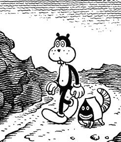Editor's note : Even a comic art dummie can appreciate the surrealistic splendor of Jim Woodring's art. Born in Los Angeles in 1952, Woodring describes his childhood as "made interesting by frequent hallucinations, apparitions, disembodied voices and other psychological malfunctions." After stints as a garbage man and animator, Woodring capitalized on his childhood "malfunctions" in his "illustrated autojournal," JIM, eventually published by Fantagraphic Books. Woodring's work has been featured in publications as diverse as Kenyon Review, World Art Magazine, and Zoetrope journals to the well known Frank comics.