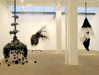 Down the street from Lelong, Nataraj Sharma's show at Bose Pacia (Jan. 20 - Feb. 19) was interested in a more conceptual treatment of the organic and non, primarily that often uneasy relationship between man and machine. The Baroda, India-based artist's large-scale paintings and etchings convey a great anxiety concerning India's relationship between industry, human worth, and ecology. One of his most haunting paintings, the triptych Studio Karkhana (2003), shows a single male figure, face in shadow and body sagging, surrounded on either side with the tools and products of mechanical industry, which look both mysterious and threatening in a brownish-gray half-light.