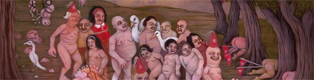 “I am trying to do the same thing on different levels,” Jacobsen says, of the relationship between his paintings and his performances. “But they supplement each other. I get ideas from each that eventually show up and influence the other.” This is nowhere more evident than in the titles Jacobsen chooses for his songs and paintings; paintings with titles like "Blustering Bullies Embark On Bare-Bottom Drill For Doughnut Muscle Diaper Bulge Thrills" and “Sweat Stained Fancy Heap For First Rate Ladies,” sit easily alongside song titles such as, “Dance of the Retarded Girl Slumped Sideways,” and “Pathetic Dance of Failure.”