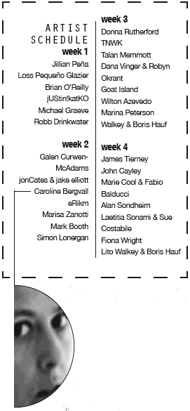 Bergvall’s combination of lecture and, later, performance, demonstrates one of the most intriguing aspects of the series; at times, in the translation from idea to actual exhibition (or, in this case, performance) the ultimate aim of the curator is not fully recognized by his or her audience, or at worst, lost completely. In a series such as OPENPORT, which deals with a vision of artistic practice that remains, at present, somewhat theoretical, the inclusion of artists’ personal commentary and explanation of their own work provides a helpful context with which to interpret the series and envision the sort of artistic future which the curators envision. Bergvall’s lecture, for example, included her intrigue with the idea of the face, a preoccupation which found its way into Fig, the performance she presented as part of the series. “You don’t have a face, per se, until someone sees it,” Bergvall explained in her lecture. “You’re caught in someone else’s gaze.” While Fig, as a performance, was rich and thought provoking, the curators’ logistical decision to supplement the series with personal commentary was especially helpful in interpreting their vision.