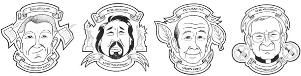 Like many Americans, we here at F Newsmagazine are counting the days until the nation’s least popular president since Richard Nixon is out of office. And, yes, there are many, many days until that happens. In the meantime, we’re mulling the options. There’s that Mormon with really handsome sons, the New Yorker who takes a lot of credit for the city’s recovery after 9-11 and that Democrat who ran with John Kerry in 2004. Hmm. We might resort to choosing one of those wealthy Dems with Illinois roots. If nothing in that selection tickles your fancy, may we suggest a third-party candidate? These people usually know they don’t have a chance in Hades, but they’ll be darned if they don’t try!* Take a look: