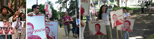 Chung called it “aggressive positivism,” and his experience with this project illustrates not only the power of a positive message through “political” means, but the evolution of an artwork once it is taken over by the masses. By May of 2007, approximately 200 individuals gathered at a major intersection in Hawaii, wielding signs asserting similar messages to Chung’s original posters. The spectacle, he said, was overpowering. To be clear, Chung is no Pollyanna. He was aware of the messages’ apparent shallow and unspecific qualities. The art that inspired these “protests,” however, was conceptually weightier.